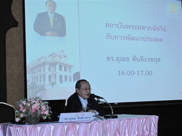 ดร.สุเมธ ตันติเวชกุล กรรมการและเลขาธิการมูลนิธิชัยพัฒนา เป็นวิทยากรบรรยายเรื่อง ''สถาบันพระมหากษัตริย์กับการพัฒนาประเทศ''  ณ จุฬาลงกรณ์มหาวิทยาลัย